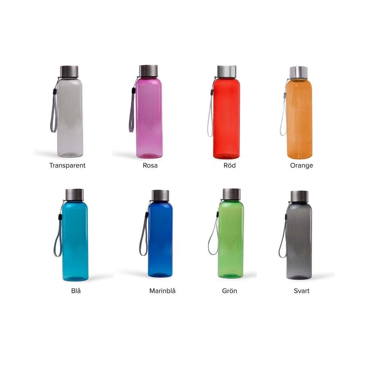 Snygg flaska i BPA-fri TRITAN-plast, lock i rostfritt stål med en tygögla i locket så att man kan hänga flaskan på en krok eller runt handleden.