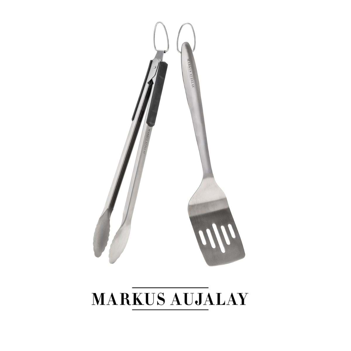 Exklusivt och gediget grillset noga utvalt av Markus Aujalay gör grillningen till en ren njutning. Grillredskapen är gedigna med silikon i handtagen för bästa grepp, men ändå mjuka i formen och sköna att greppa. Markus logo på handtagen.