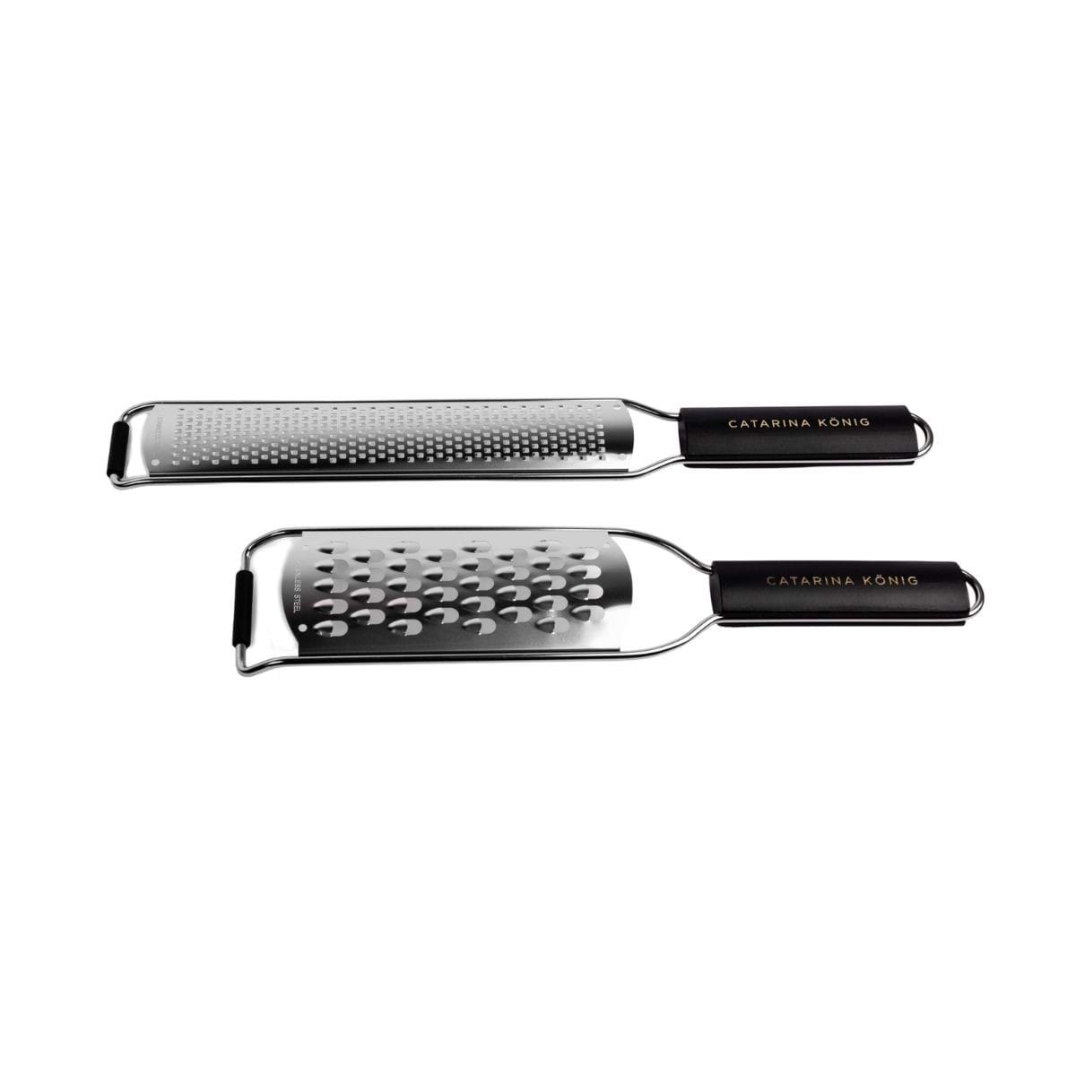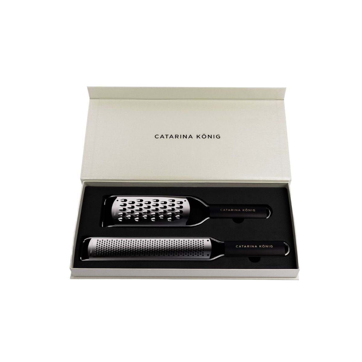 Ett set med två rivjärn i olika storlekar från Catarina König som passar utmärkt till att riva ost, zest eller choklad. Ett måste i köket för att sätta guldkant på maten eller bakverken. Setet består av medium grovt rivjärn 29cm och ett zestjärn 34cm. Båda kommer med ett svart trähandtag och är tillverkade i rostfritt stål.