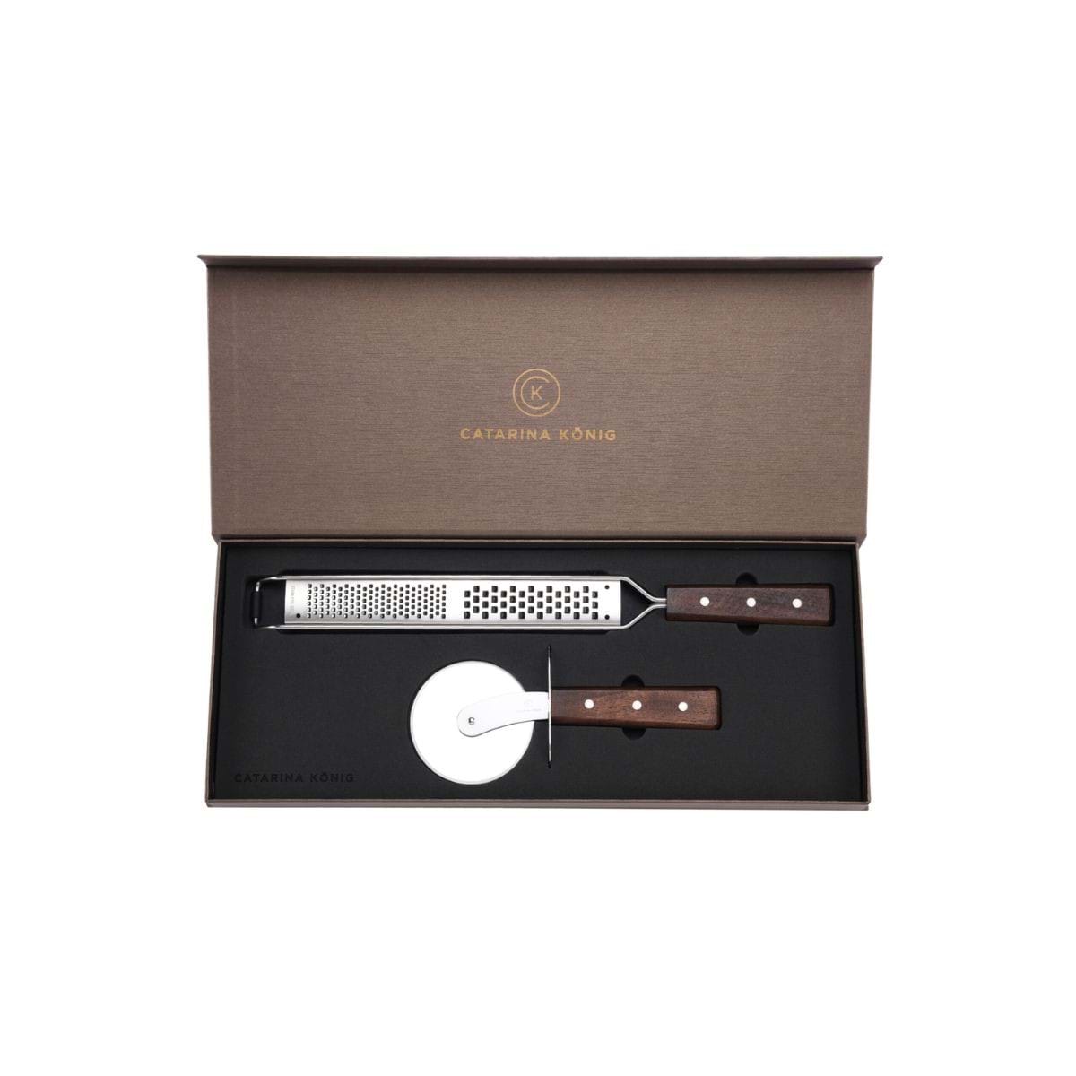 Detta set kommer med ett ordentligt rivjärn med 2-i-1 funktion som gör det enkelt kan riva hårdost, zest eller choklad, samt en pizzaslicer som skär pizzan med ett jämnt och rent snitt. Båda är tillverkade i högkvalitativt rostfritt stål med vackert handtag i valnötsträ.