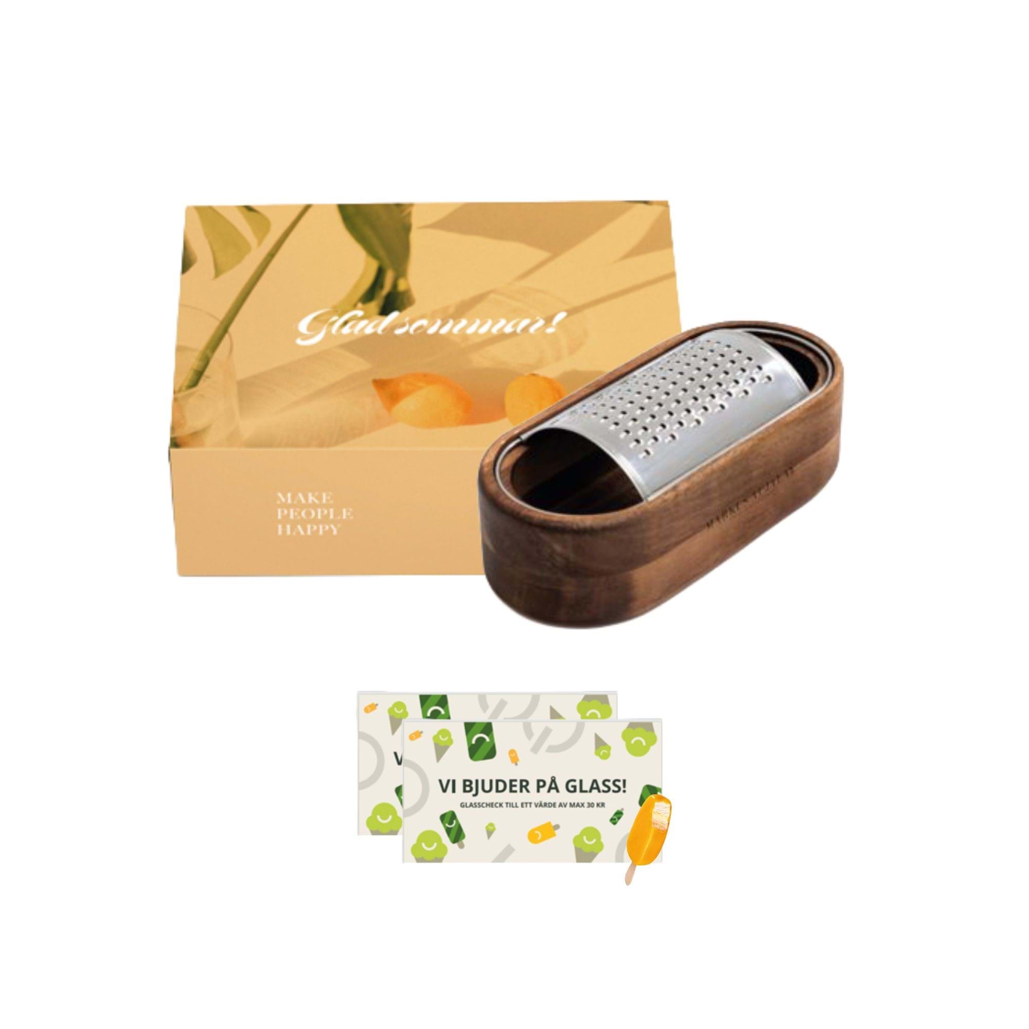 En perfekt gåva när du inte vet vad du ska ge - en Gåvobox med ett rivjärn och två glasskuponger värda 60 kronor, paketerat i en somrig förpackning.