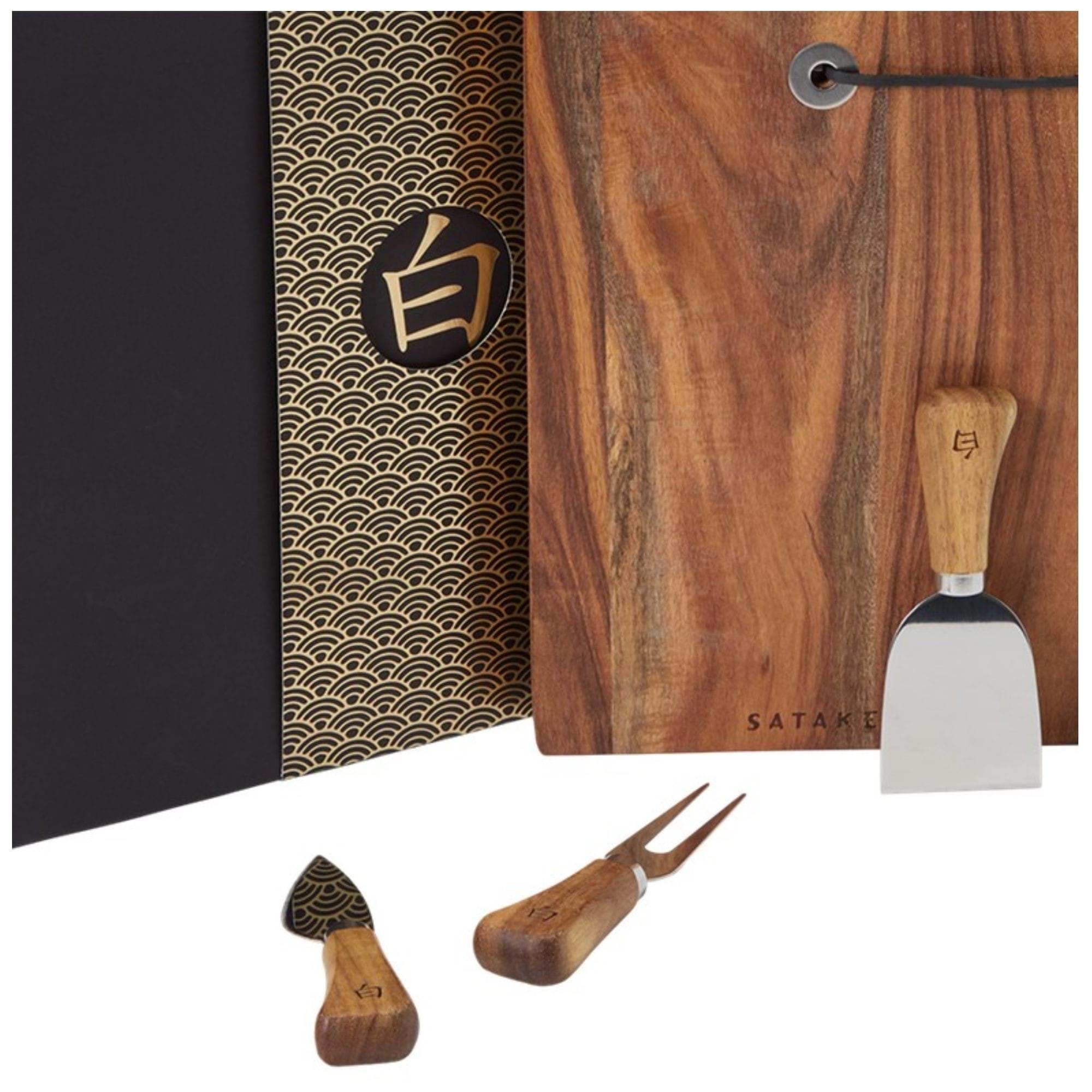 Ett läckert set från Satake med skärbräda och tre ost- och charkredskap, en kniv, en spatel och en gaffel. En uppskattad gåva, som passar livsnjutaren och de som vill servera med klass och stil.