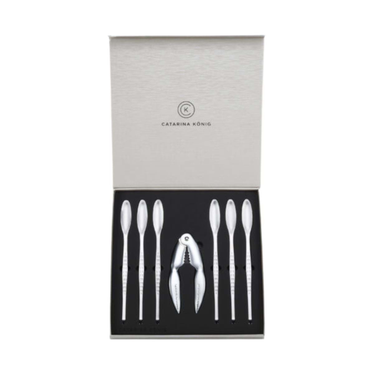 Ett elegant skaldjursset beståendes av 7-delar i kreativt jordgubbsmönster. I setet ingår en robust krabbklo och sex avlånga smala gafflar, perfekt för att nå varje bit av havets delikatesser. Tillverkade i rostfritt stål med en mattborstad finish som höjer varje dukning.