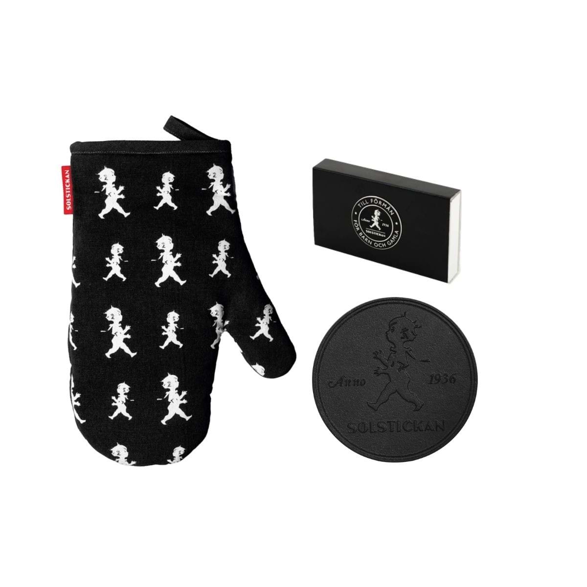 Detta kit från Solstickan innehållet ett grytunderlägg i gjutjärn, en grytvante och en tändsticksask. Grytunderlägget är inte bara en praktisk gåva utan även en stilren och ett dekorativt tillägg i köket. Underlägget har fyra gummifötter som skyddar underlaget. Vadderad grytvante i 100% bomull i det klassiska mönstret med Solstickepojken.