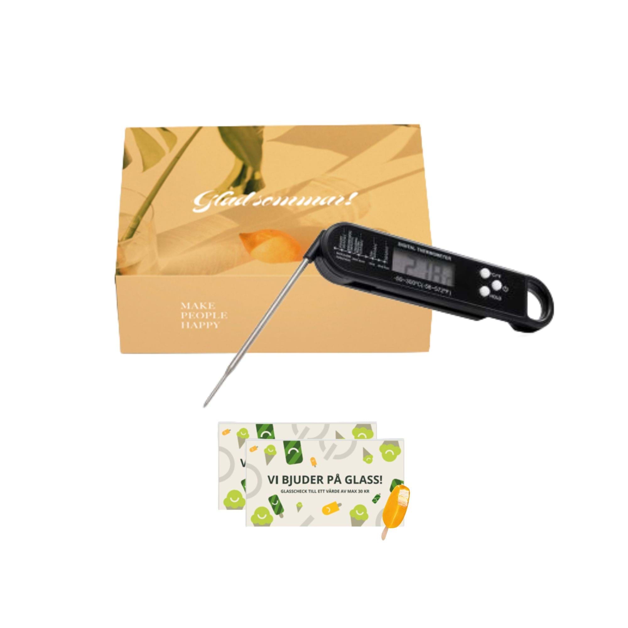En perfekt gåva när du inte vet vad du ska ge - en Gåvobox med en termometer och två glasskuponger värda 60 kronor, paketerat i en somrig förpackning.