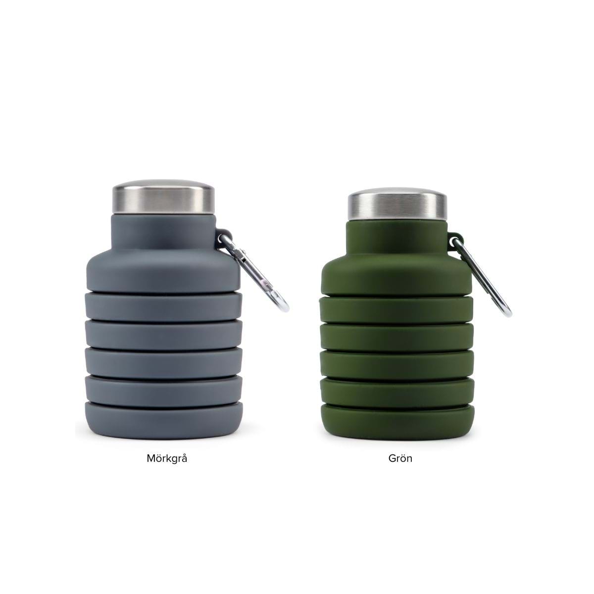 Flaska i silikon som du lätt kan tryck ihop och dra isär för att göra större eller mindre. En perfekt outdoorprodukt för att minimera packningen. I toppen finns en karbinhake för att hänga på exempelvis ryggsäcken.