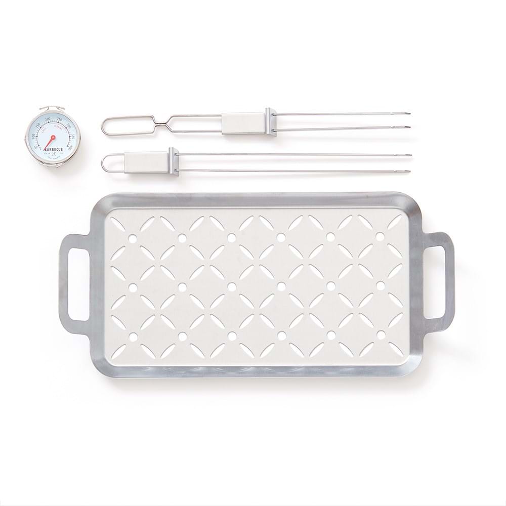 Innehåller en grillbricka i rostfritt stål, två stycken grillspett samt en yttermometer.