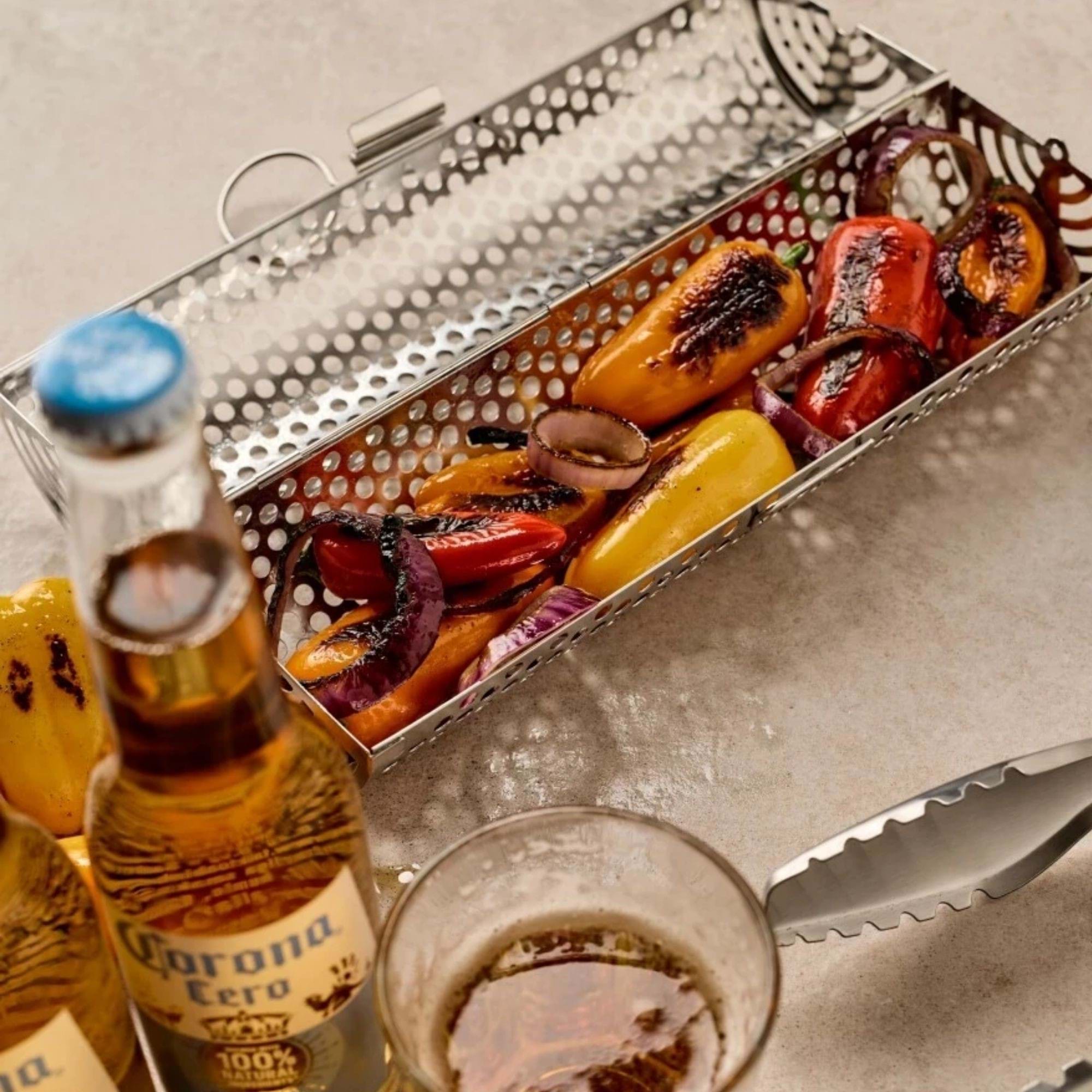Med hjälp av denna grillcylindern kan du grilla grönsakerna till perfektion. Den cylinderformade konstruktionen gör så att grönsakerna, eller mindre bitar av råvaror, inte trillar ner genom gallret.