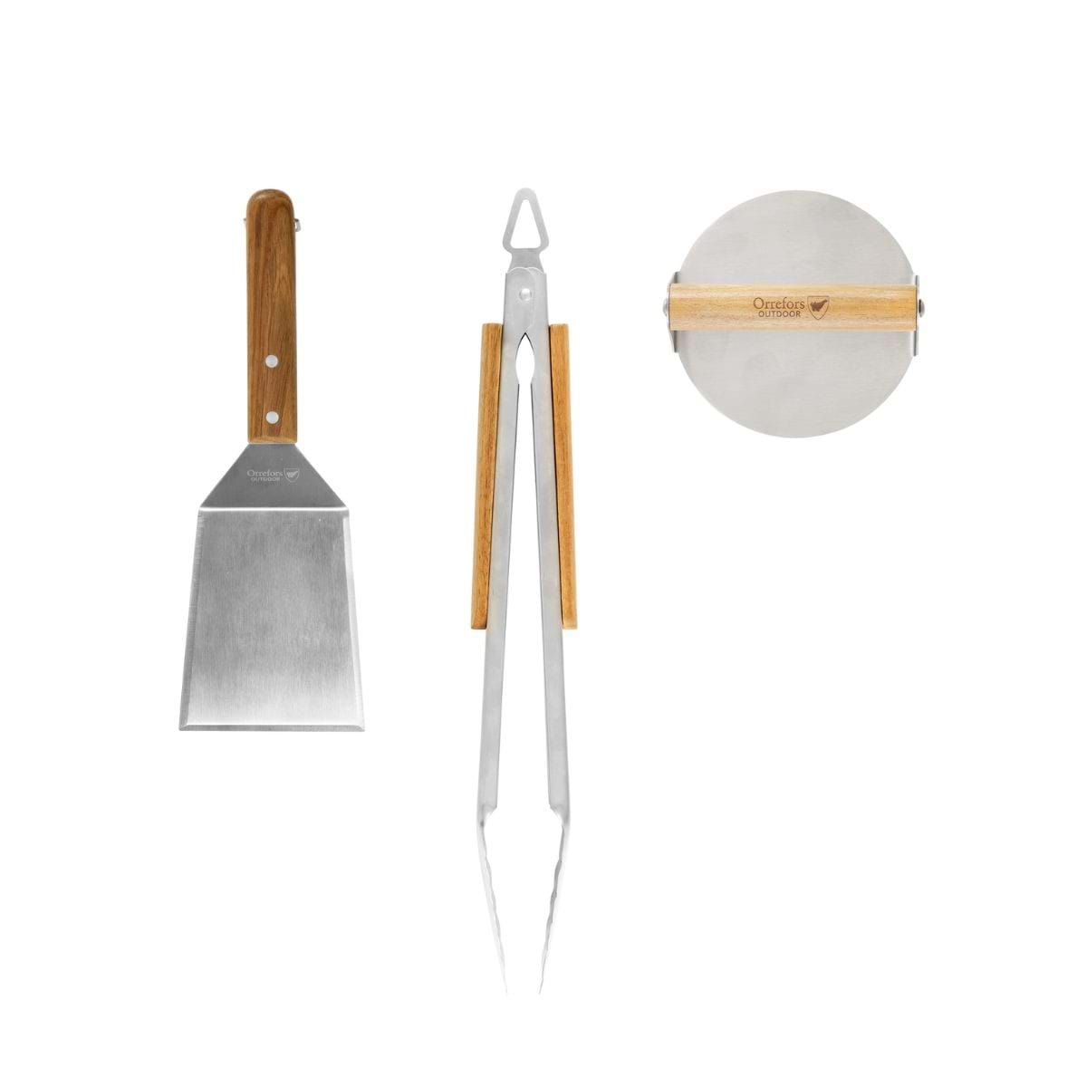 Ett robust grillset i rostfritt stål med akacia handtag, skapt för hamburgare men byggt för att som hör utelivet till. Kommer i set med spade, tång och hamburgersmashare.