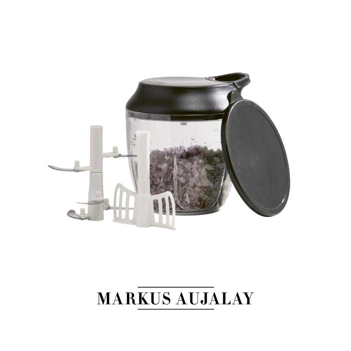 Markus Aujalays lätthanterligs stora universalhackare är av hög kvalitét. Funkar att hacka morötter, lök, kryddor samt krossa is. Den kan även vispa grädde och kommer med ett lock, vilket även gör den till en förvaringsburk.