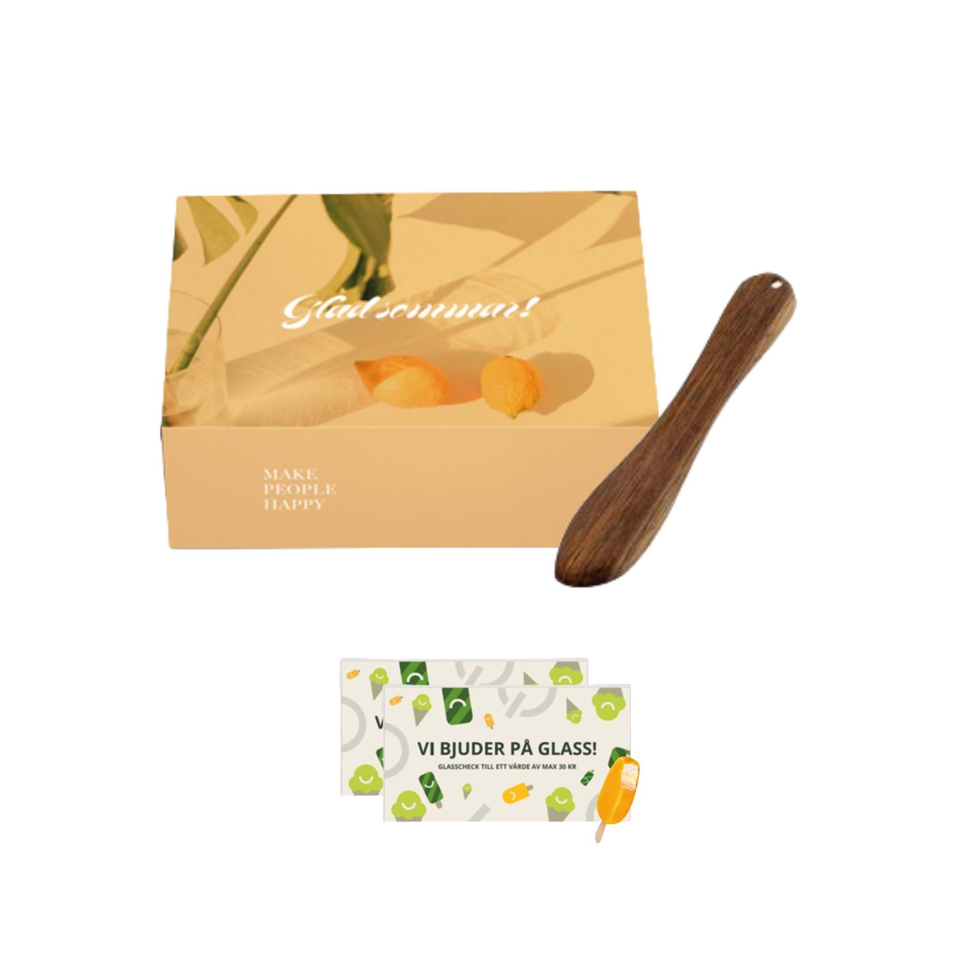 En perfekt gåva när du inte vet vad du ska ge - en Gåvobox med en smörkniv och två glasskuponger värda 60 kronor, paketerat i en somrig förpackning.