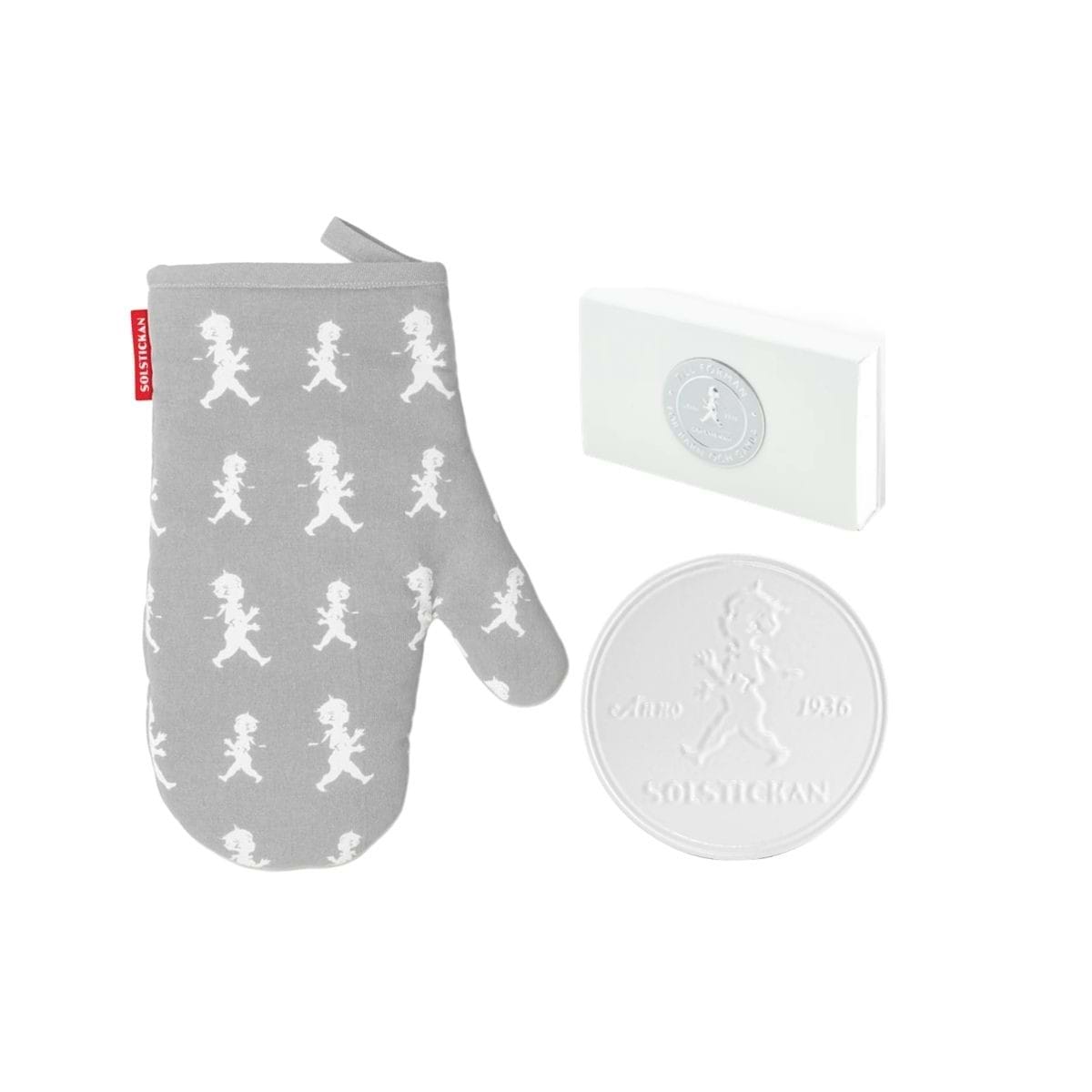 Detta kit från Solstickan innehållet ett grytunderlägg i gjutjärn, en grytvante och en tändsticksask. Grytunderlägget är inte bara en praktisk gåva utan även en stilren och ett dekorativt tillägg i köket. Underlägget har fyra gummifötter som skyddar underlaget. Vadderad grytvante i 100% bomull i det klassiska mönstret med Solstickepojken.