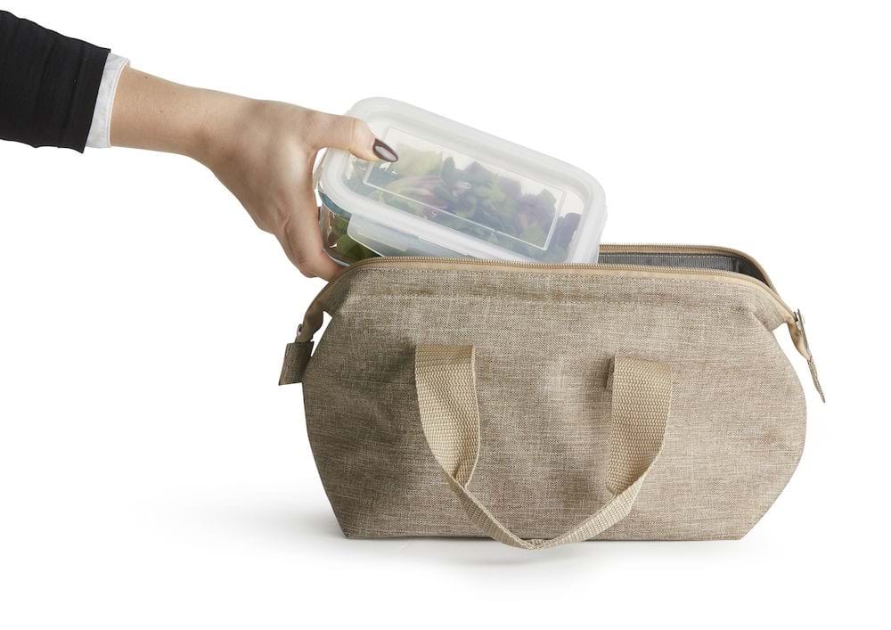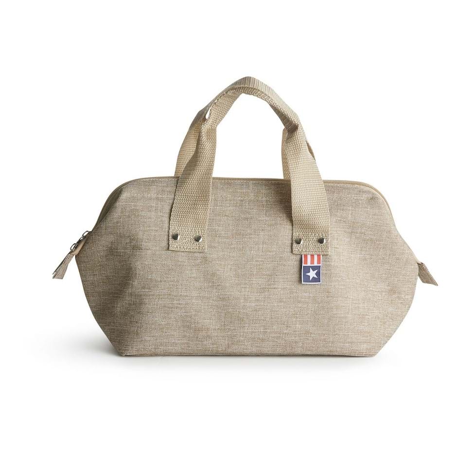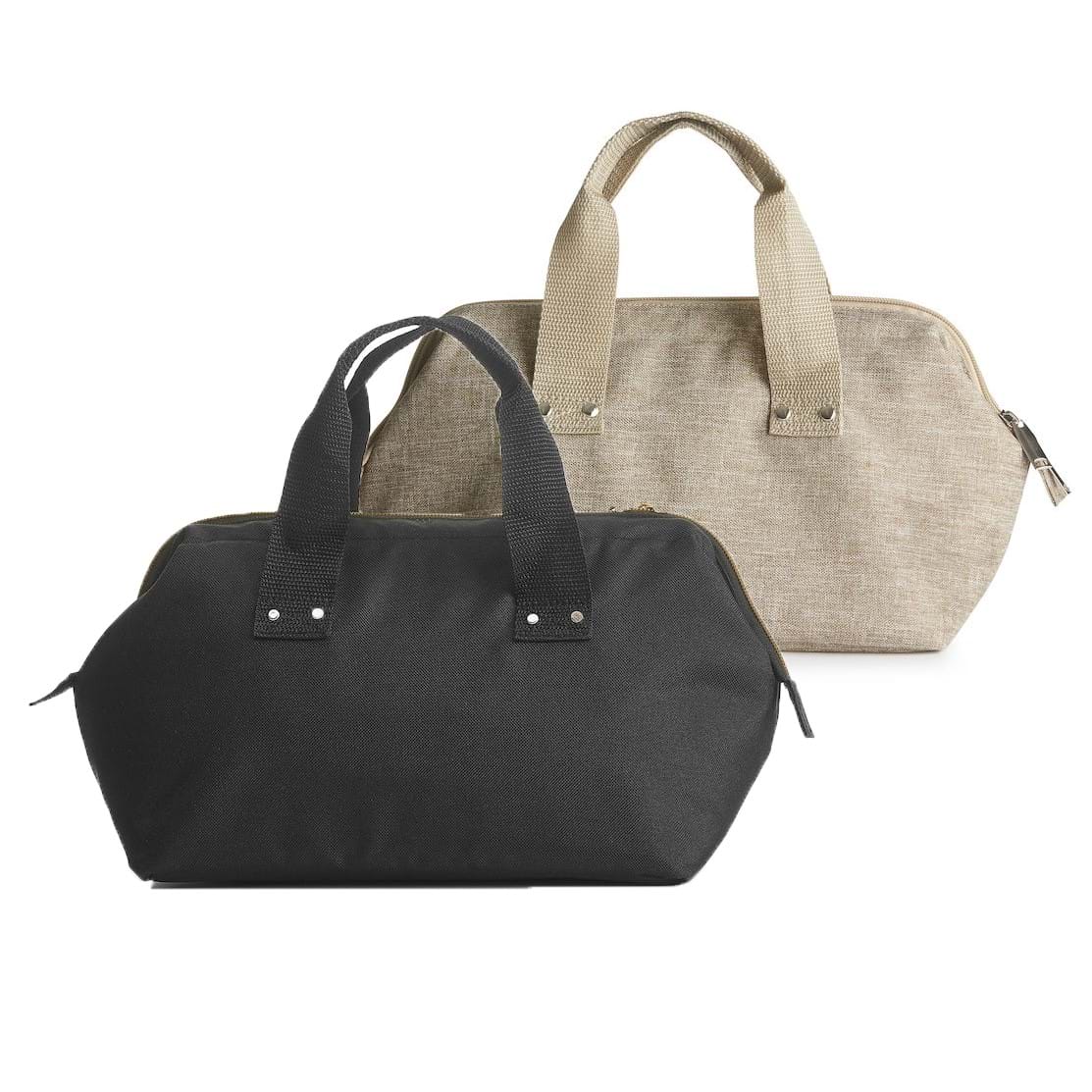 Liten kylväska i perfekt storlek för matlådan till jobbet eller stranden. Svart väska med detaljer i guld och beige väska i linne look.