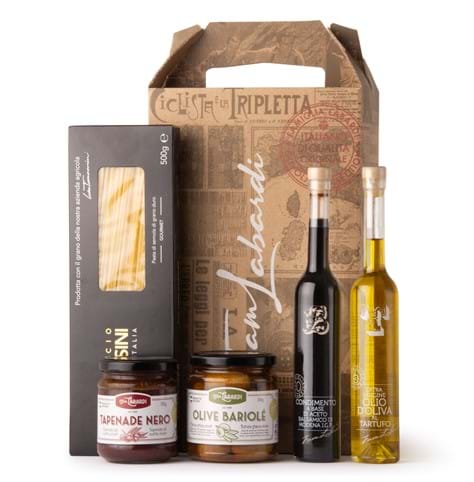 INNEHÅLL: Fam. Labardi Gröna oliver 290g & Tapenade Svarta oliver 190g. Fam. Labardi Olivolja Tryffel 100 ml. Fam. Labardi Balsamvinäger 100 ml. Tommasini Pasta Lunga Spaghettoni 500g.