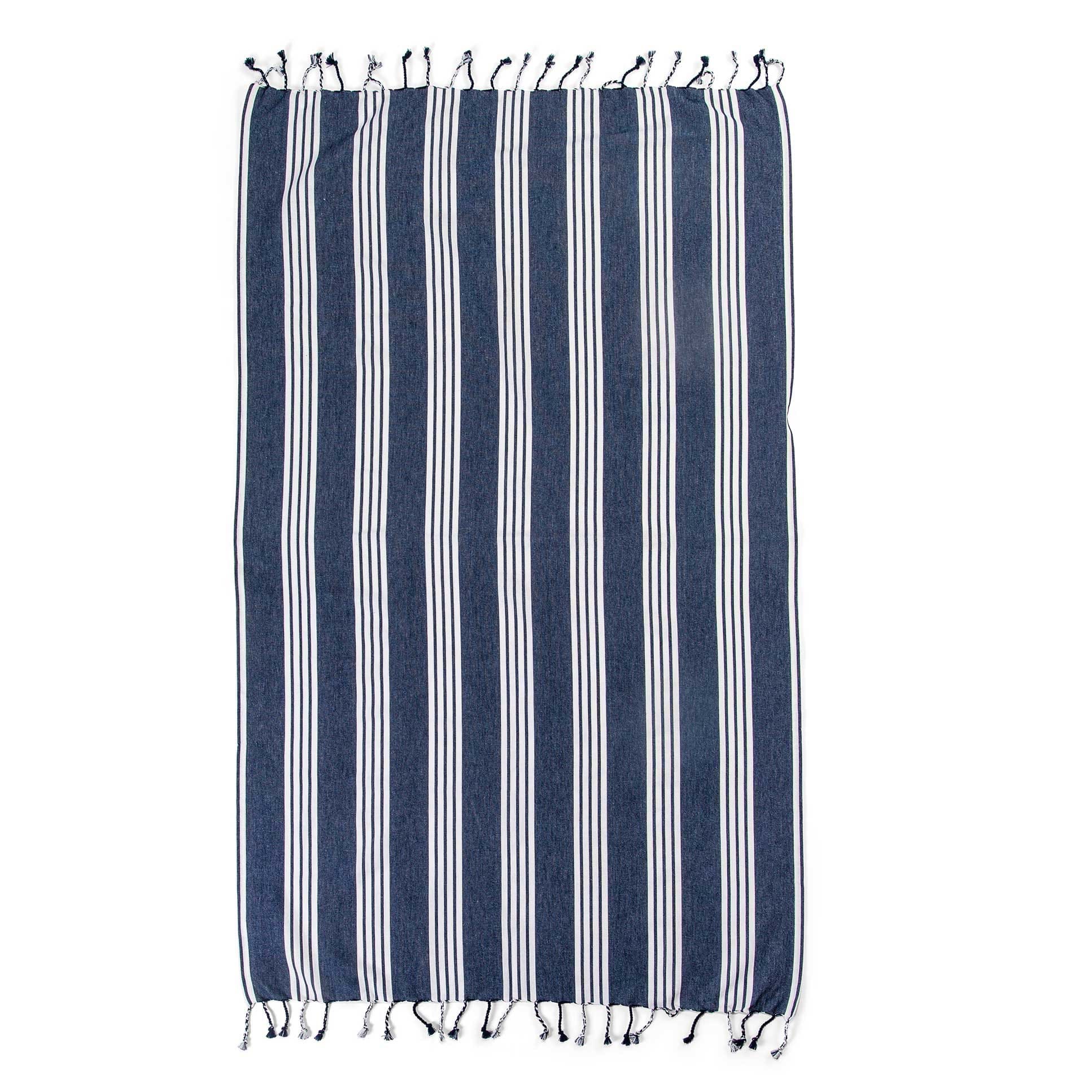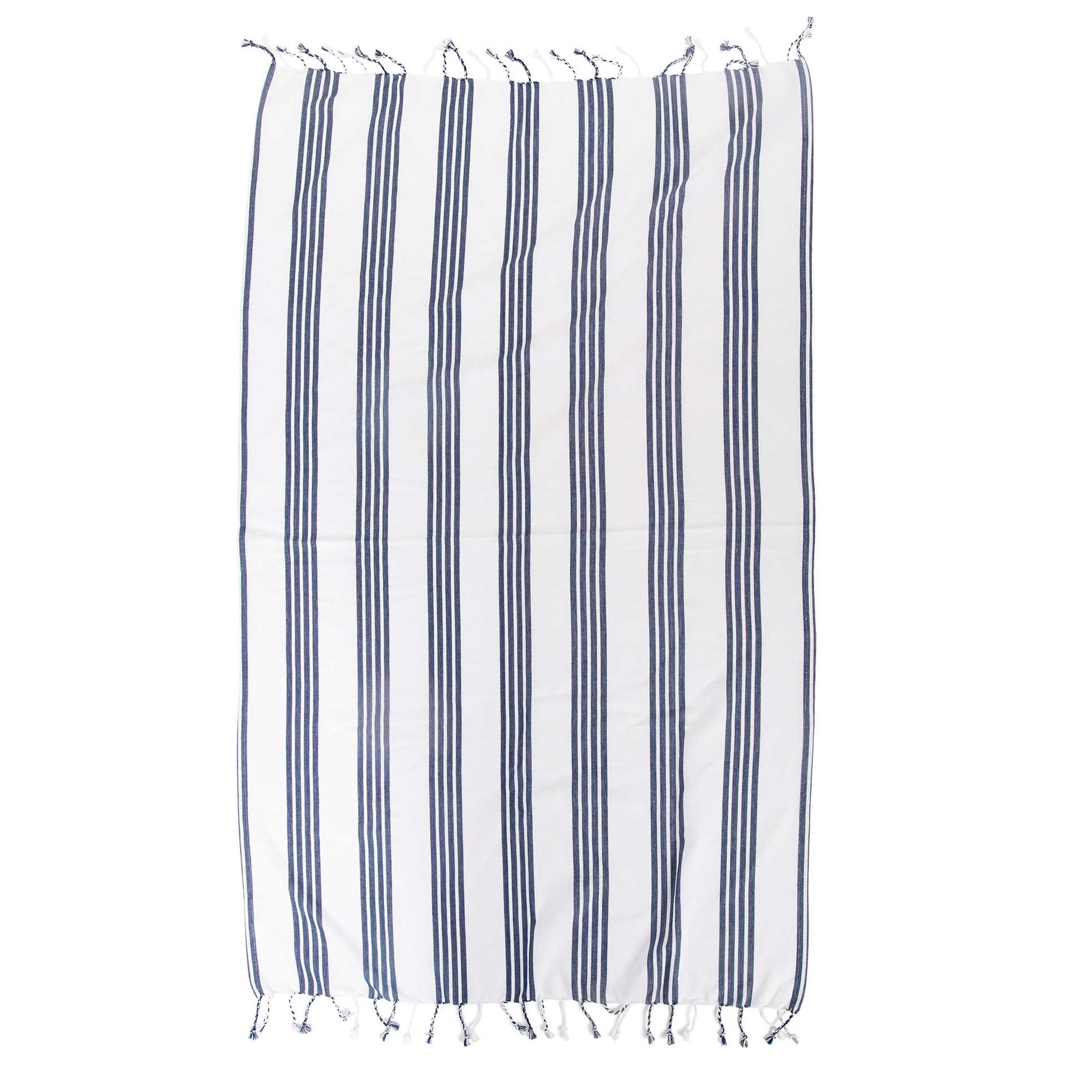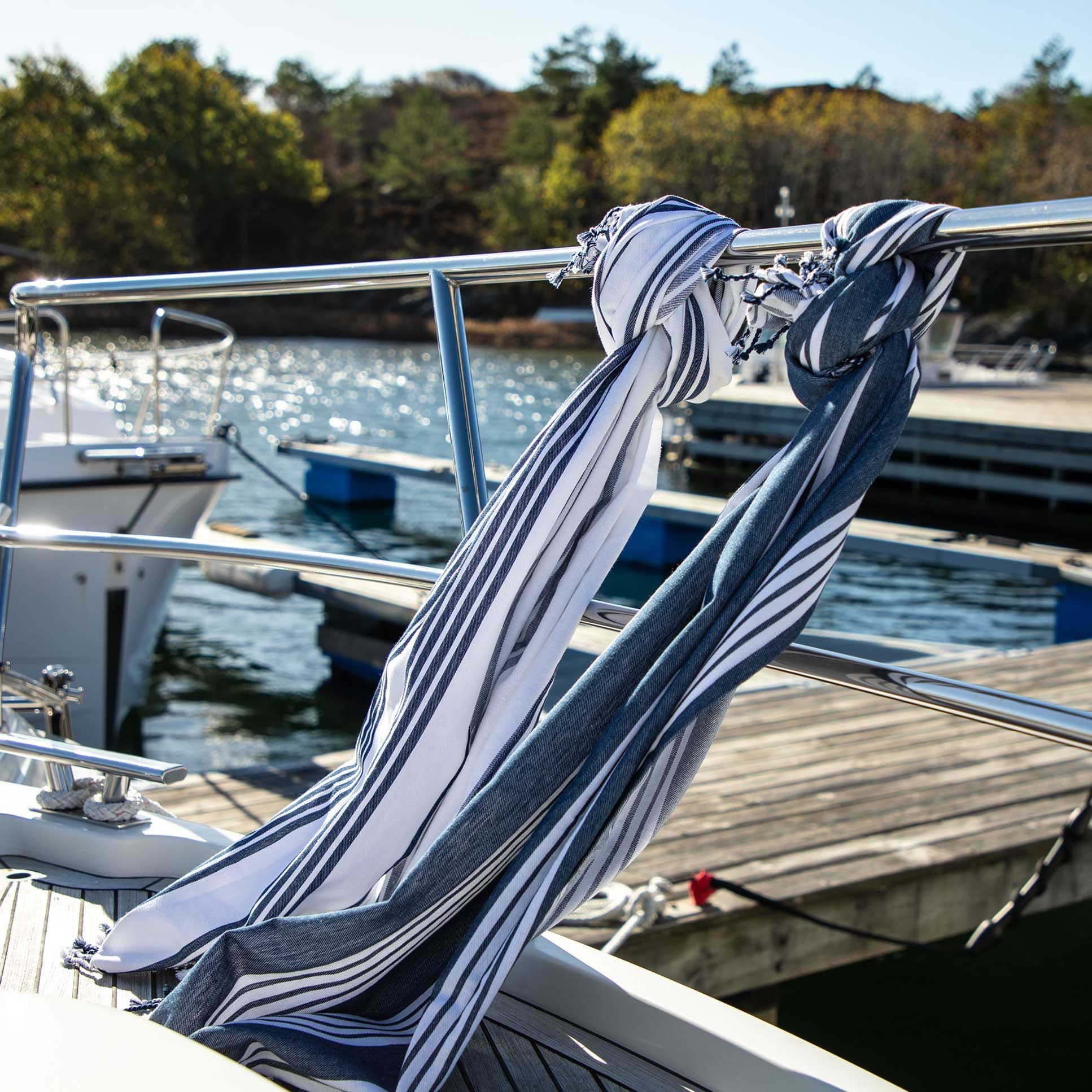 Finns med vit botten och marinblå ränder samt med marinblå botten med vita ränder.