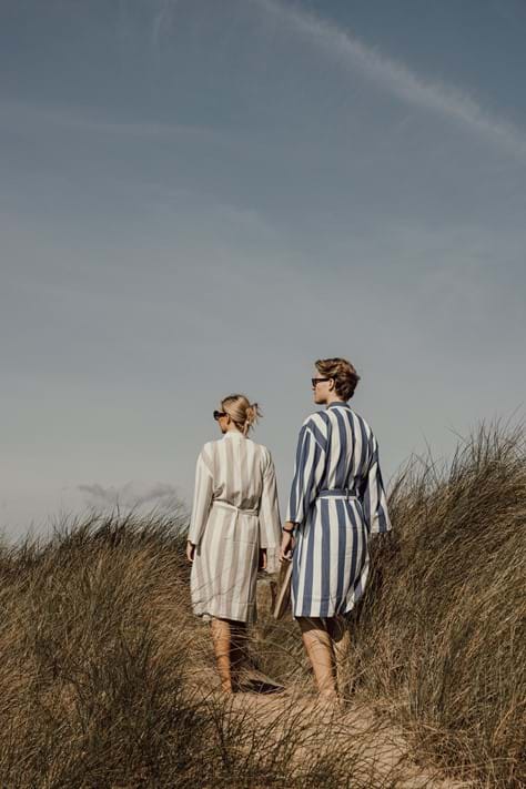 Ornos hamambadrock är både mjuk och bekväm vilket gör den perfekt att bära både på stranden och i hemmet. Tillverkad i en lätt och luftig blandning på 200 gsm, kombinerar den bomullens mjukhet med polyesterns snabbtorkande egenskaper. Badrocken har en tidlös design med ett tvåfärgat randigt mönster, nätt krage, framfickor, 3/4-ärmar och ett midjebälte som ger en bekväm och anpassad passform.