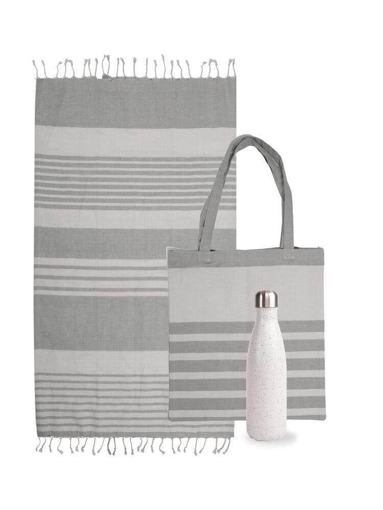 Kitet inkluderar Ella hamam handduk (90x170 cm) och en matchande påse, båda mönstrade i klassiska ränder med mjuka, naturinspirerade färger, tillverkade i tunn återvunnen bomull (70%) och polyester (30%). Tillsammans med vår populära vattenflaska Nils skapar de en oslagbar kombination. Nils är utrustad med avancerad vakuumisolering med dubbla stålväggar och ett kopparhölje som håller din dryck iskall i upp till 24 timmar eller varm i upp till 12 timmar, och dessutom eliminerar kondens. Så, oavsett var du är, håller detta kit dig redo för avkoppling och äventyr utomhus.