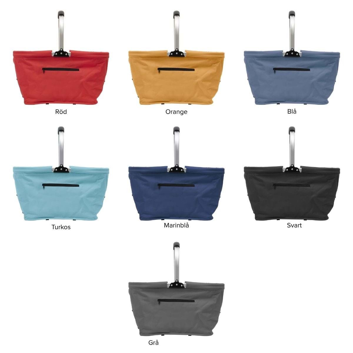 Hippfällbar korg med bärhandtag. Korgen har ett fack med dragkedja på sidan för att lätt kunna lägga undan nycklar när man handlar eller bär korgen.